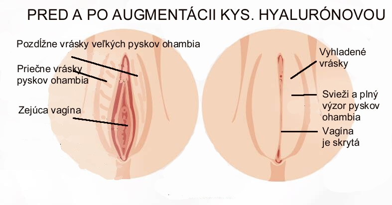 Augmentačná labioplastika kyselinou hyalurónovou je procedúra založená na dodávaní kyseliny hyalurónovej, ktorá zabezpečí vyhladenie vrások, zväčšenie objemu, elasticitu a hydratáciu veľkých pyskov ohanbia.